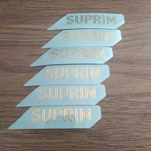 這個金色貼紙的材質是鎳,也叫電鑄薄標,當然可以根據您的要求制作不同的顏色、圖案、字母等內容。