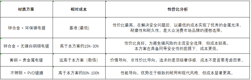 免責聲明: 本方案完全基于您所提出的“鎳材質(zhì)經(jīng)過環(huán)保驗證,無過敏風險”這一核心前提。在實際應(yīng)用中,建議務(wù)必向終端品牌方清晰傳達并提供相應(yīng)的環(huán)保認證文件,以確保信息透明和商業(yè)合規(guī)。