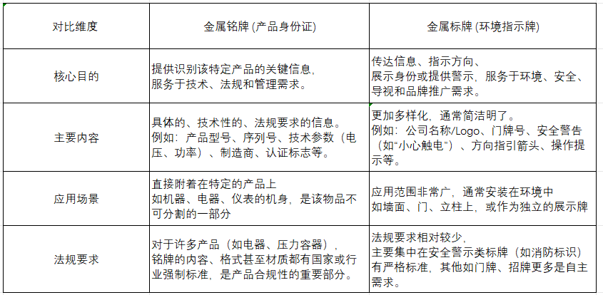 金屬銘牌和標牌雖然都是用金屬做的,但在生活中扮演的角色完全不同。簡單來說,銘牌是產品的“身份證”,而標牌是環境的“指示牌”。